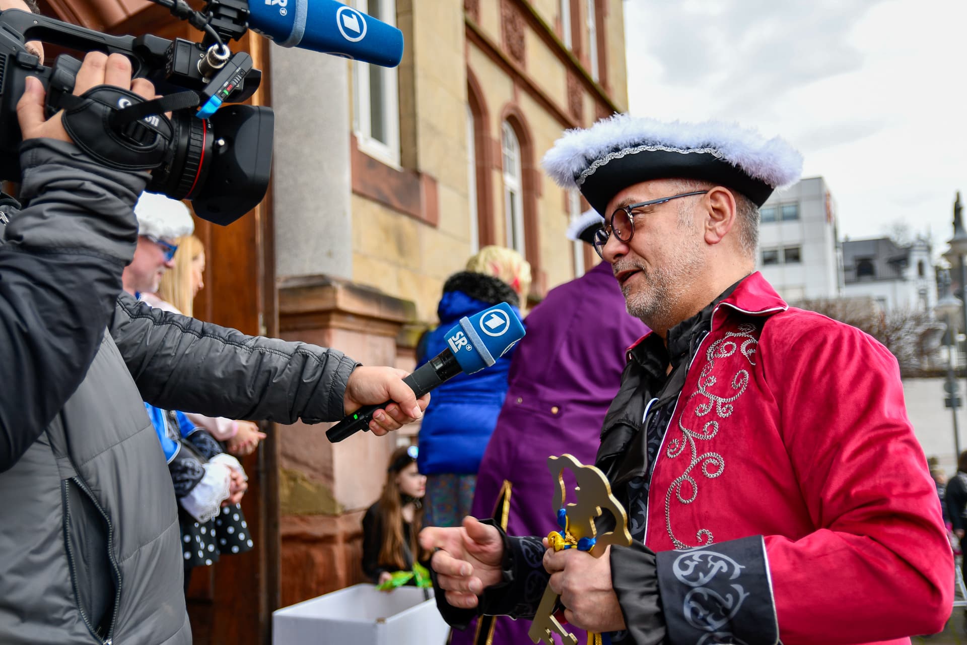 Doch so einfach wollten wir uns natürlich nicht geschlagen geben. Unser wurfstarkes Mitarbeiterteam versuchte, mit Kamellen die Närrinnen und Narren auf Distanz zu halten. Am Ende mussten wir uns dann aber doch geschlagen geben, obwohl uns sogar noch Dr. Carolin Lehberger, die Leiterin der VHS Saarbrücken zur Hilfe eilte. Also übergaben wir das Rathaus samt Schlüssel an die Narren.